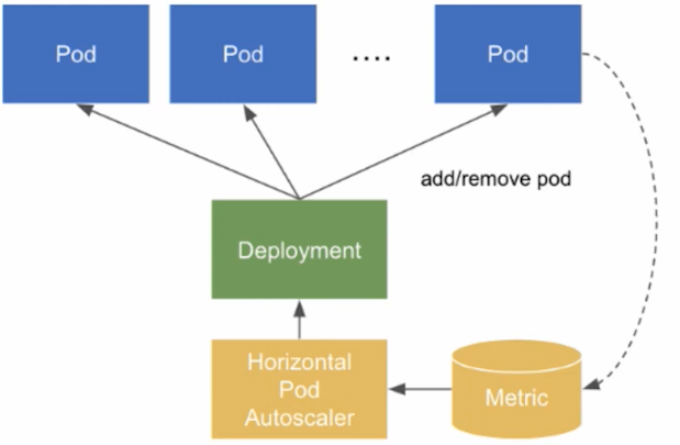 RC / RS / Deploymen를 통해 실행되는 Pod의 Scaling이다. 설정된 주기(Default 30초)마다 CPU 사용률등의 Metric을 모니터링하며, DaemonSet에는 적용되지 않는다.