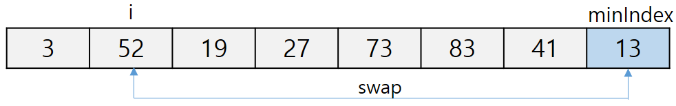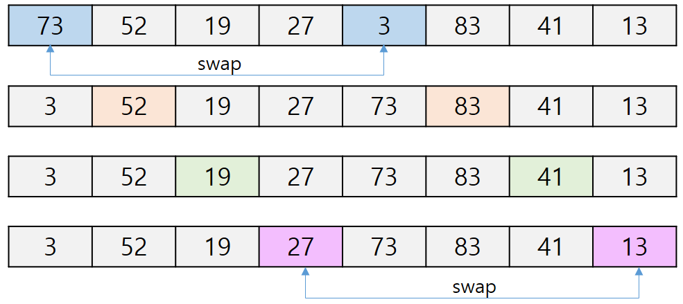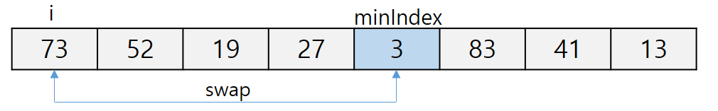 : 주어진 데이터에서 가장 큰 값 또는 작은 값을 찾아 선택하고 교환하여 정렬