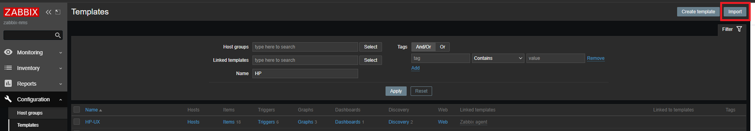 - 등록할 장비에 맞는 Template을 zabbix에서 import