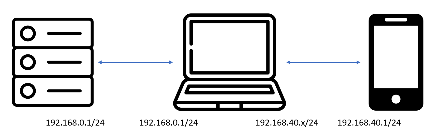 먼저, 휴대폰 테더링으로 제공되는 와이파이에 접속된 노트북을 서버와 다이렉트로 연결해줍니다. 그리고 노트북과 서버의 각 포트에 통신에 사용할 같은 대역의 사설 IP를 할당해주고 서로를 게이트웨이로 바라보도록 합니다.