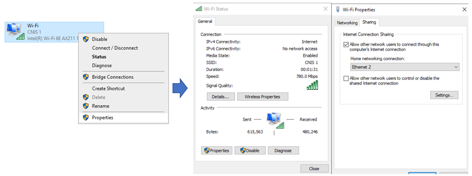 서버와의 IP 대역을 디폴트 라우팅보다 더 낮은 Metric으로 설정해 줍니다. 그리고 '제어판 - 네트워크와 공유센터 - Wi-Fi 인터페이스 - 속성'에서 아래의 그림 처럼 이더넷 네트워크를 쉐어링 해줍니다.